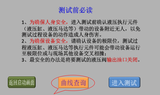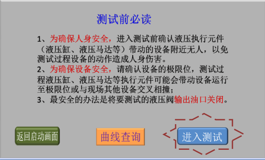 3、確認(rèn)現(xiàn)場(chǎng)人員和設(shè)備安全后,點(diǎn)擊“進(jìn)入測(cè)試”,進(jìn)入液壓閥測(cè)試類(lèi)型選擇畫(huà)面;