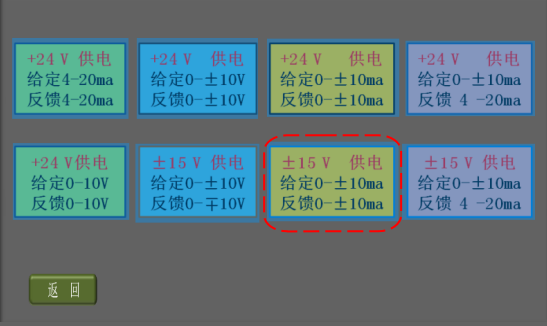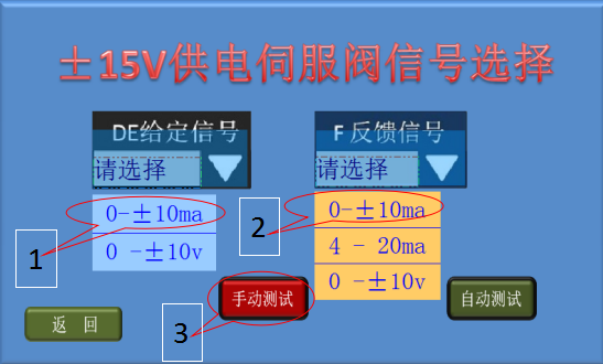 7、手動(dòng)測(cè)試基本正常后,點(diǎn)擊屏幕左下方的返回鍵,返回伺服閥信號(hào)選擇畫(huà)面;