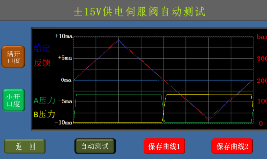 6、伺服閥正常時(shí)的表現(xiàn)為:a、給定電流0ma時(shí),反饋電流在0ma,伺服閥輸出的A、B腔壓力相同;b、用滑動(dòng)條可迅速換向,反饋電流改變且A、B腔壓力差較大;c、點(diǎn)擊增加按鈕,反饋電流逐漸增加且A、B腔壓力差逐漸增大;d、點(diǎn)擊減少按鈕,反饋電流逐漸減少且A、B腔壓力差逐漸減少,過(guò)0ma后伺服閥會(huì)換向;